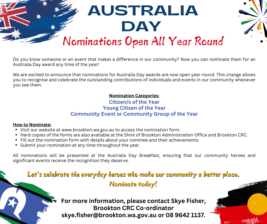 The Shire of Brookton is seeking nominations from members of the public for the 2026:-