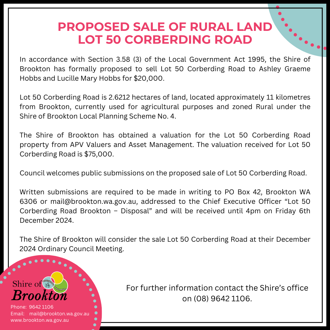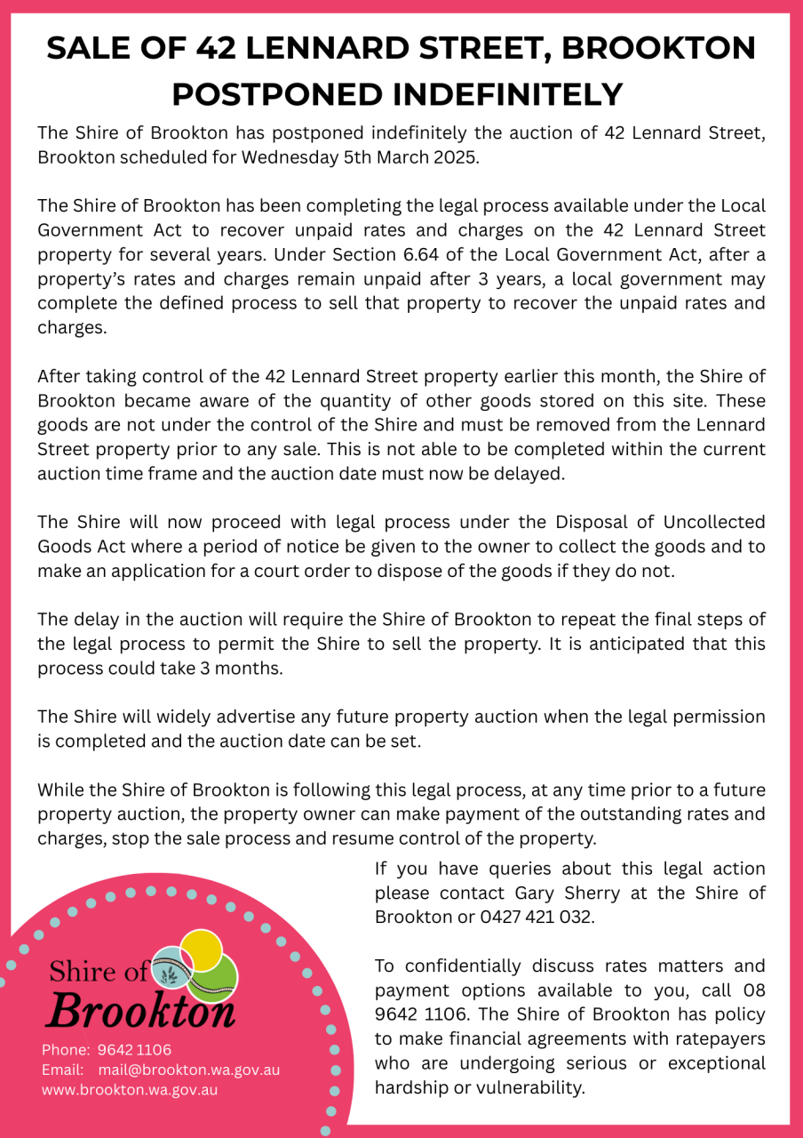 Sale of 42 Lennard Street, Brookton - Postponed Indefinitely