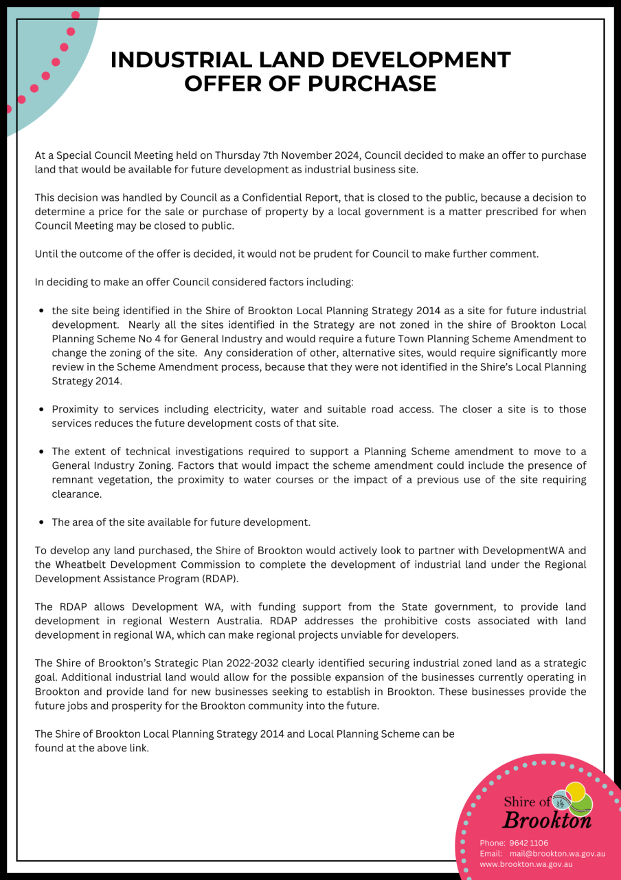 Shire of Brookton Planning Information: https://www.wa.gov.au/government/document-collections/shire-of-brookton-planning-information