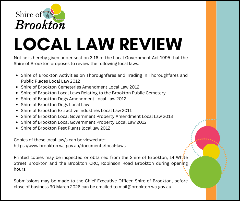 Copies of these local law/s can be viewed at:- https://www.brookton.wa.gov.au/documents/local-laws